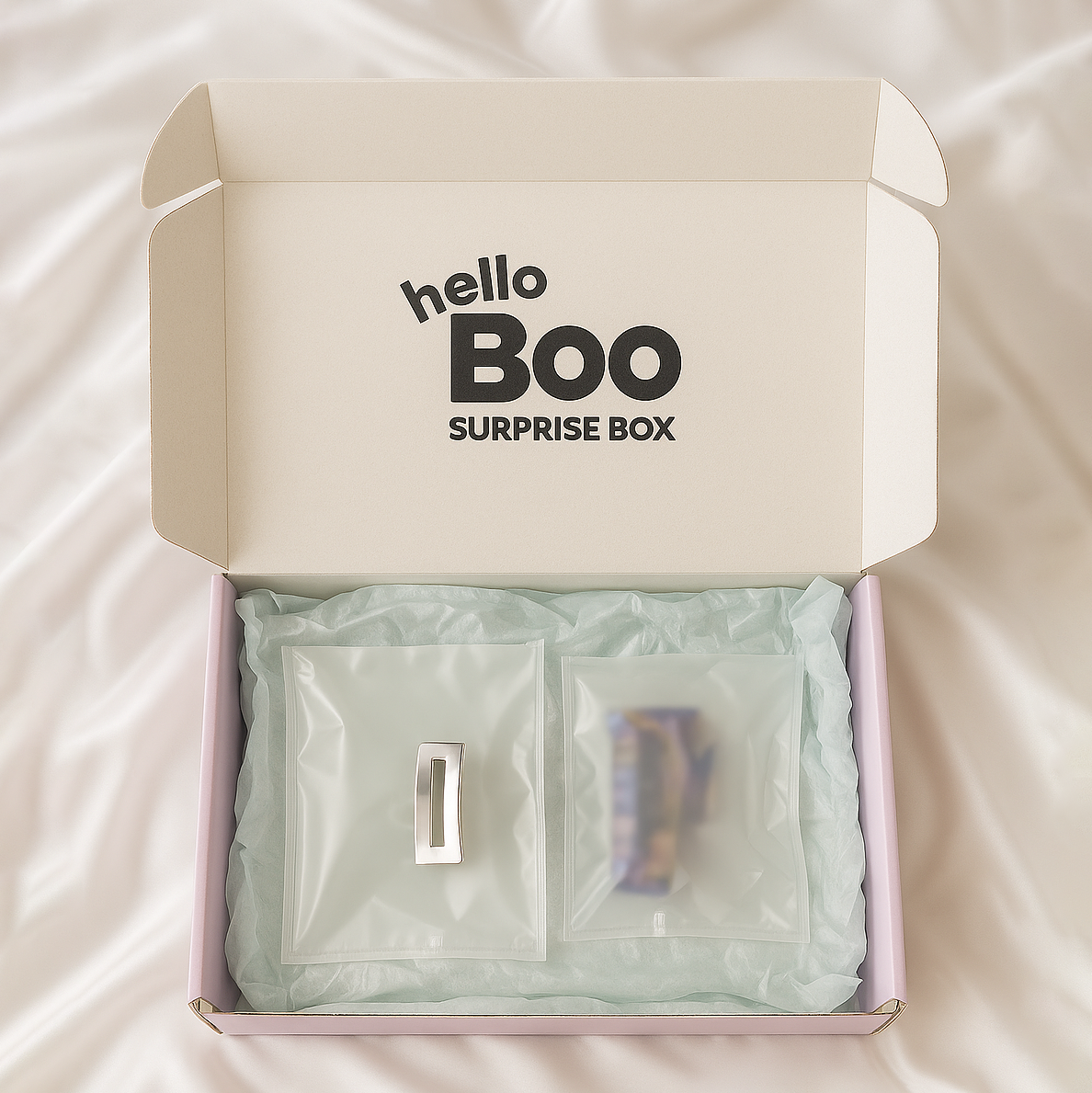HelloBoo surprise boxes contains guaranteed products of equal value and are not considered gambling. All designs shown are part of the possible pool you may receive — there are no ultra high-value items and no misleading surprises. No raffles—just surprise and delight!