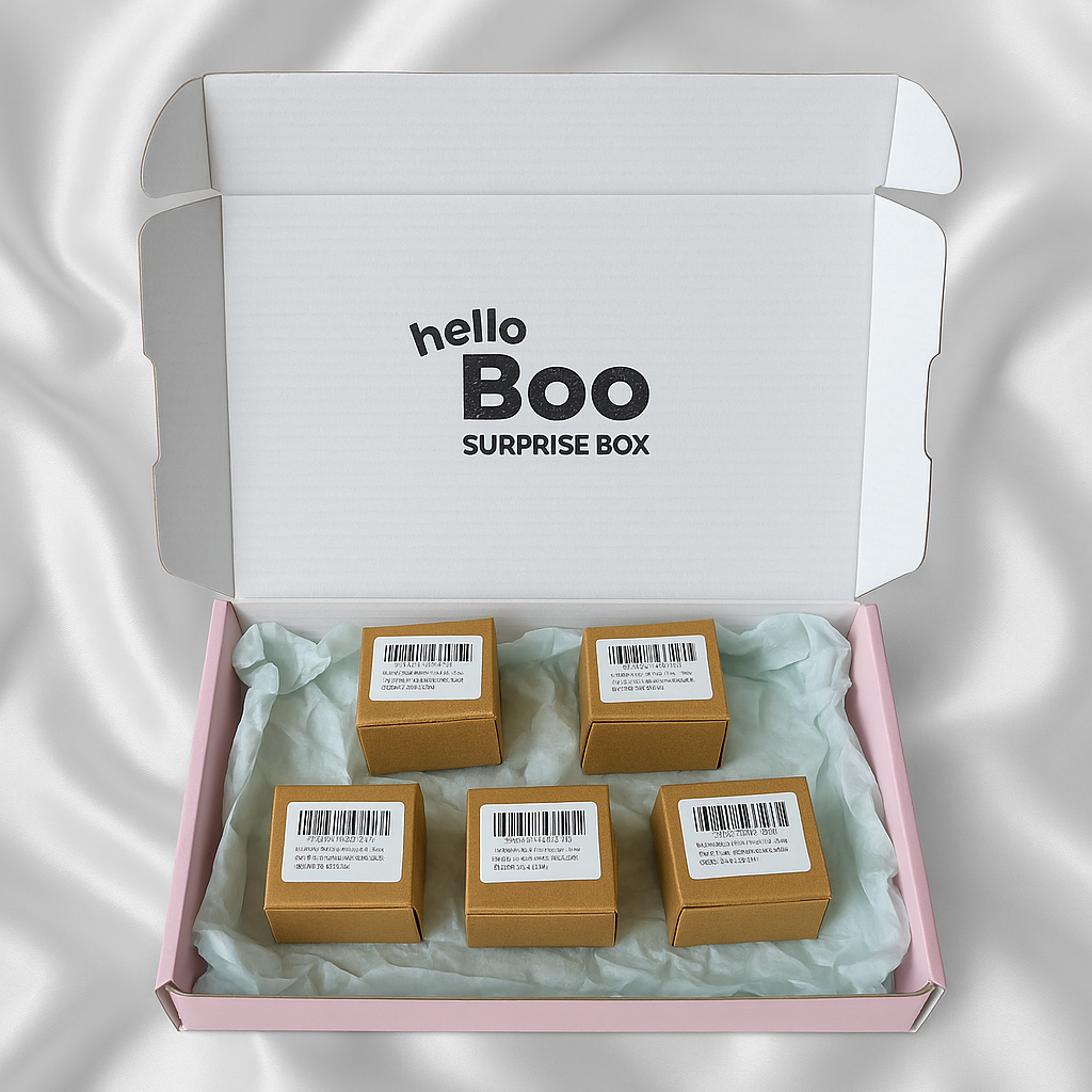 HelloBoo surprise boxes contains guaranteed products of equal value and are not considered gambling. All designs shown are part of the possible pool you may receive — there are no ultra high-value items and no misleading surprises. No raffles—just surprise and delight!